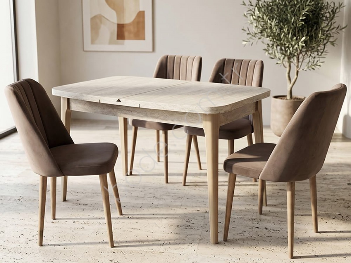 2235 +9203 BABİL TRAVERTEN DESEN TBL MDF 80*130+30 KELEBEK AÇILIR MUTFAK MASA / 1473 DAMLA BABY FACE KAHVE KUMAŞ DÖŞEMELİ KAHVR  AHŞP AYAKLI SAN